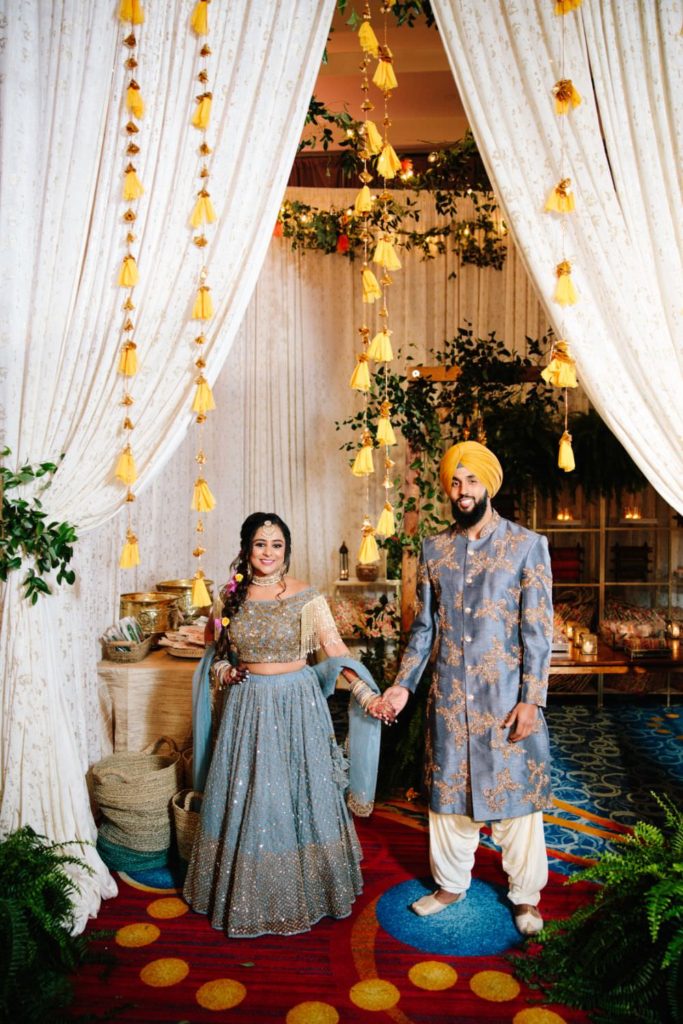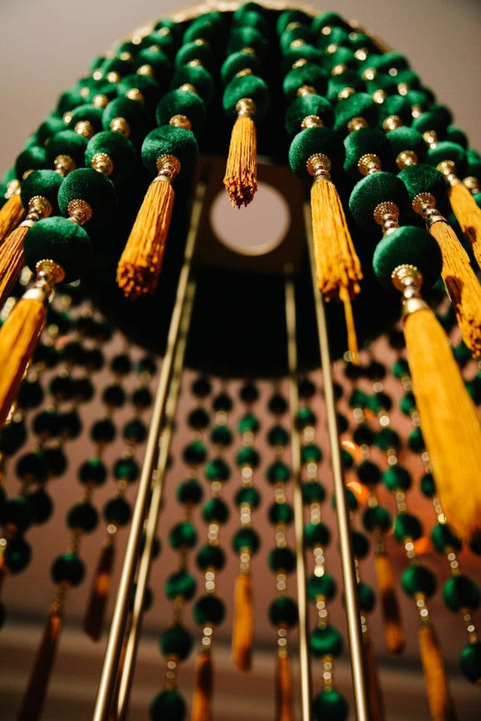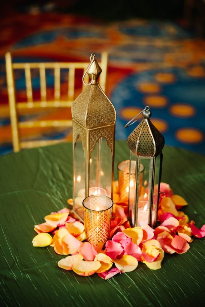 A vibrant Sangeet featuring customized head tables with velvet linens & candlelit florals. Royal mustard & deep greens tie everything together, for the perfect backdrop of a traditional Garba dance.
