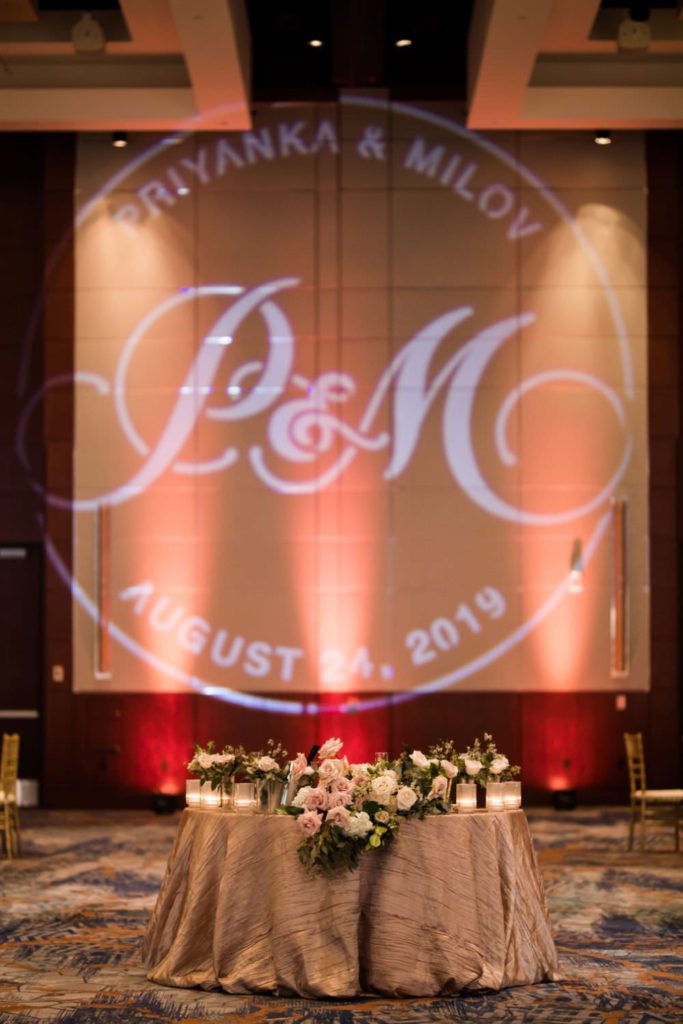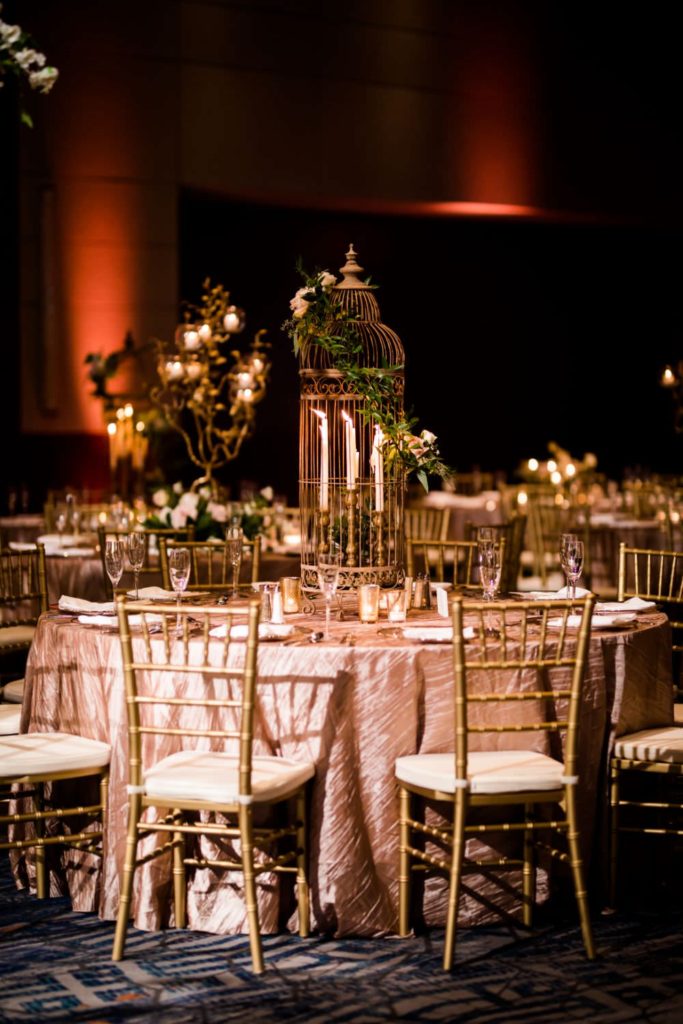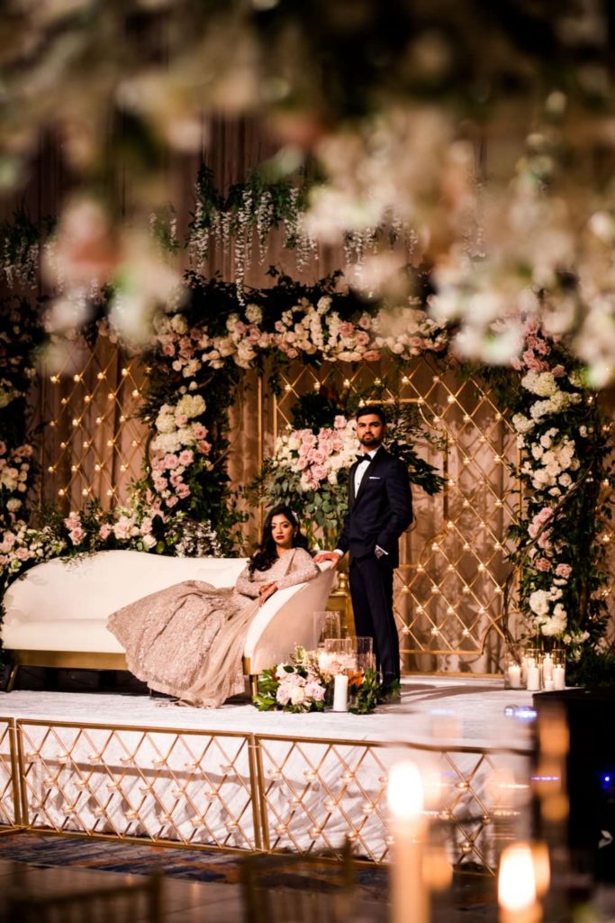 Deep forest greens complement the pearlescent neutral tones of this lush garden reception. The understated color palette spotlights the dramatic floral bridges floating over the head tables.