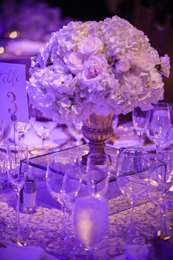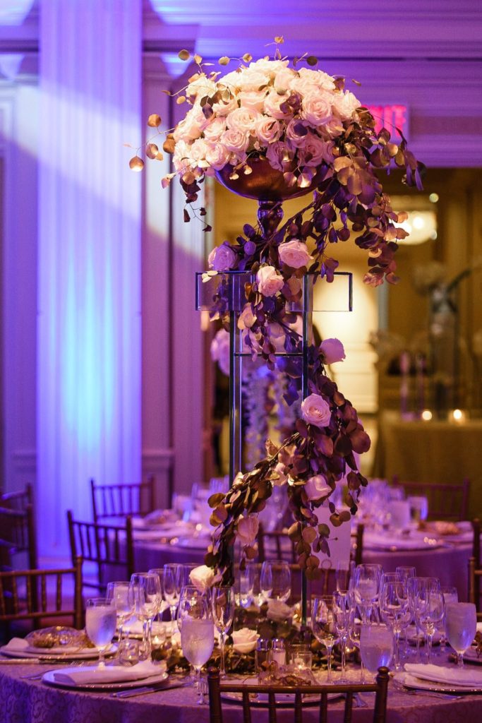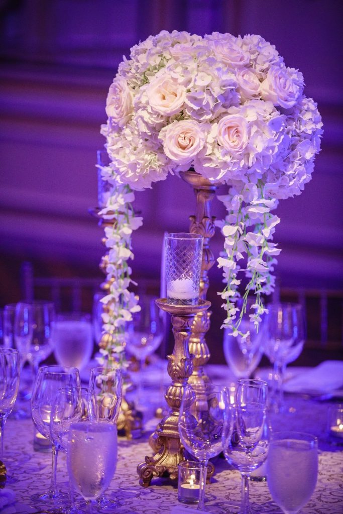 Our couple held their wedding and reception at the stunning Willard Hotel in Washington DC. With the bride and groom coming from different religious and cultural backgrounds there were two ceremonies and a reception to tie it all together. There was a Christian ceremony held at the Immaculate Concept Church adorned with 4 oversized gold vases with a lush bouquet of white flowers and a draped chiffon aisle. The bride held a cascading bouquet of lilacs, calla lilies and stephanotis blooms with a cobalt blue ribbon for the groom’s favorite color. After the ceremony, everyone returned to the Willard for the Hindu wedding ceremony. A complete change of florals, color, environment, and outfits was designed to keep transitions between events exciting. The groom absolutely did not want any greenery so we came to a compromise with an antique gold gilded eucalyptus to be used as the texture through the florals for the ceremony and reception at the Willard. Centerpieces from the reception were used to line the sides of the aisle, leading up to a classic gold pillar Mandap filled with white cherry blossom and suspended glass globes with tealight candles in the ceiling. Guests moved from the afternoon ceremony to the reception after a cocktail hour where 8’ tall arrangements sat atop narrow glass vases with cascading florals, gold gilded foliage and white roses created a luxurious ambiance amongst candle light. The stage for the bride and groom featured a 16’ width floral wall with floating shelves filled with pillar candles. The right and left side of the feature wall were accented with the oversized gold vase floral arrangements from the Christian ceremony at the church. Feel free to pin these images for design inspiration or save them for your consultation!