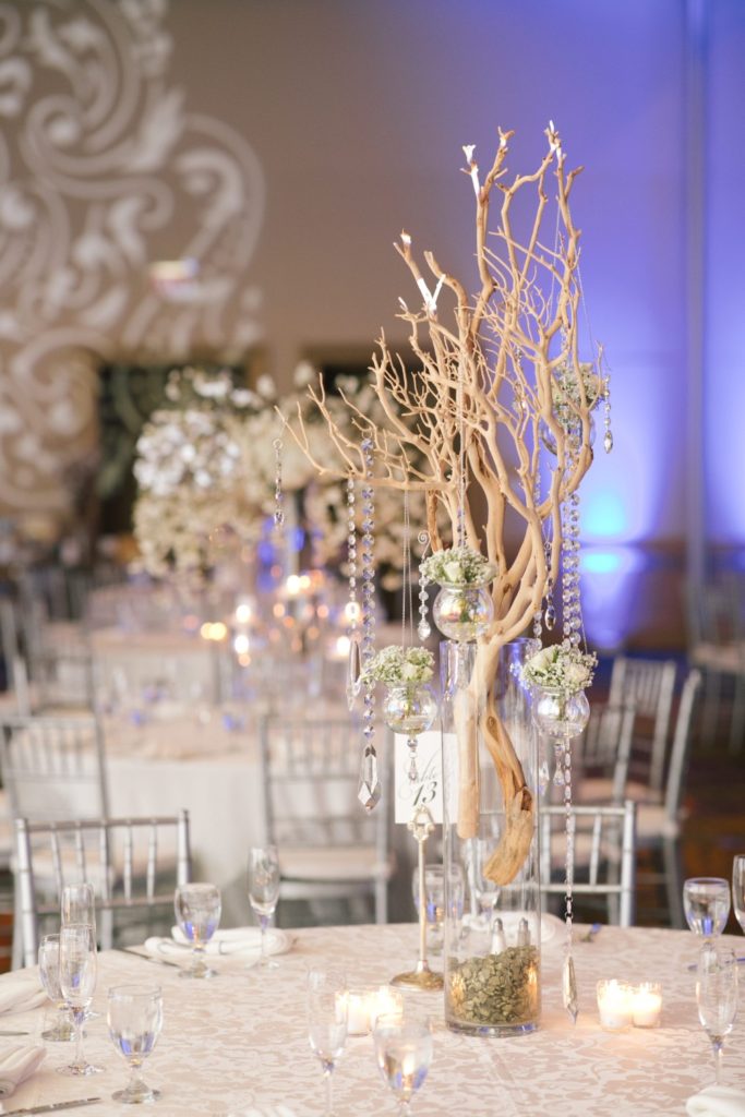 In the evening the couple’s reception florals were designed with a mix of white, ivories and branches to give a winter feel. One of the few different centerpieces featured sandblasted Manzanita branches filled with crystals and hanging glass bud vases with rose and baby’s breath arrangements. The second centerpiece had a tall assortment of cascading cherry blossom stems paired with hydrangeas with a base of glass filled with floating candles. The stage had a trio of draped arches as the backdrop for the couple, each lined with white florals with a crystal chandelier. Take a few minutes to pin your favorite images for inspiration!