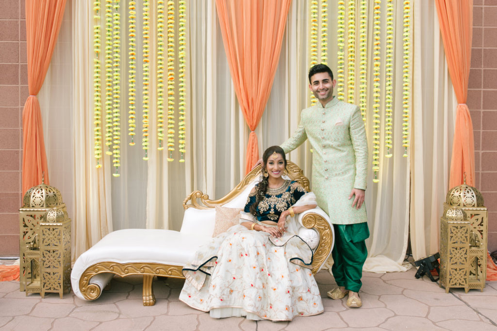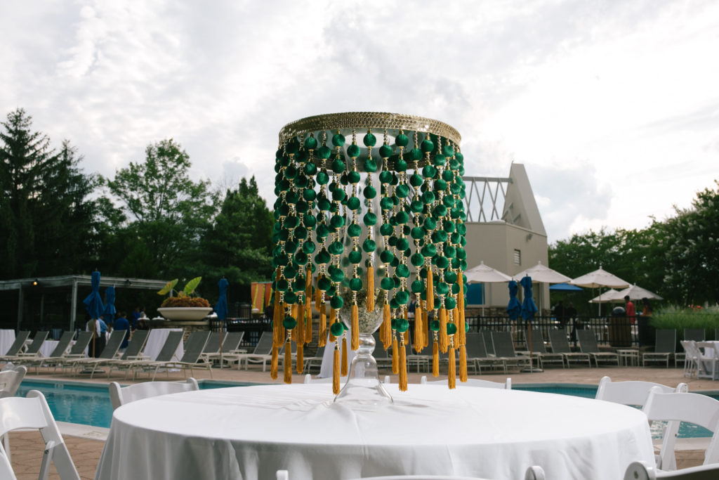 Aditi and Vishal hosted three events at The Lansdowne Resort & Spa. Their wedding weekend kicked off with an evening poolside Sangeet to gather their family and friends. Round tables served as guest seating around the pool with our signature velvet emerald tassel chandelier centerpieces, and our hand painted food carts were used for appetizer stations. A ground level backdrop was set for the bride and groom to allow for a casual feel and accessibility to mingle with guests.
